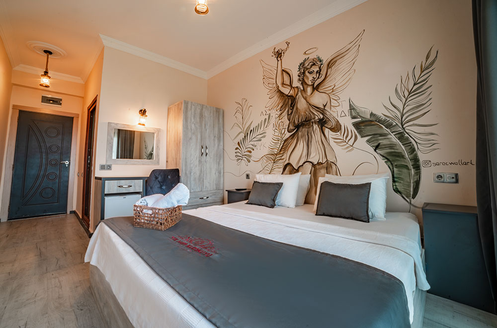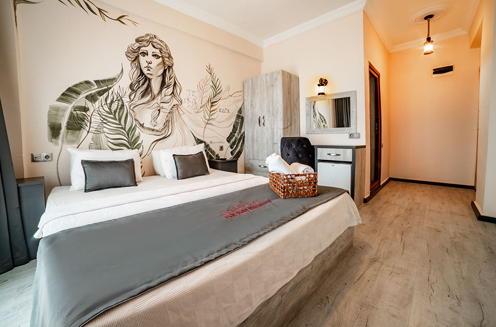 Deluxe Oda, Tek Han Kumkuyu Luxury Hotel'de lüks ve konforun buluştuğu özel bir konaklama deneyimi sunar. Bahçeye ve Akdeniz'in eşsiz deniz manzarasına bakan bu oda, 25 metrekarelik geniş alanıyla rahat ve ferah bir yaşam alanı sağlar. İki kişilik kapasitesiyle çiftler için mükemmel bir tatil ortamı sunar.
